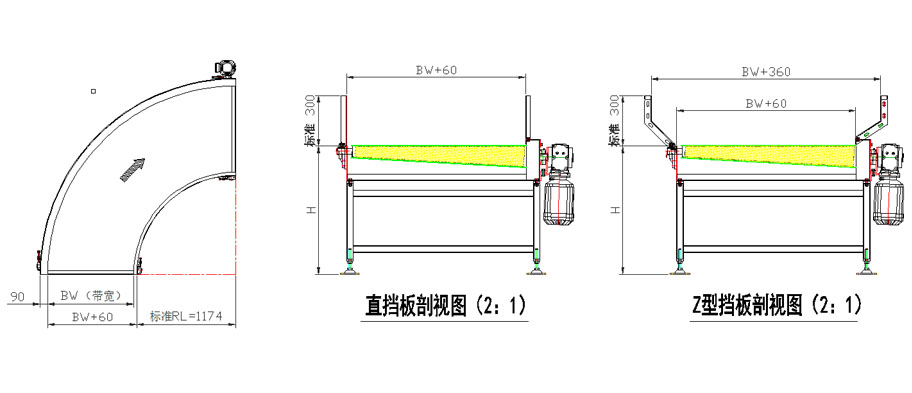 | 型號 | 皮帶寬度BW(mm) | 轉彎半徑RL(mm) | 標準高度H(mm) | 額定負載(kg) | 運轉速度(m/min) | 類別 | ||
